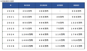 2026年は、見込み額を掲示しています。月やボーナス毎に投資資金を追加しています。また、配当金も全て再投資に回しており投資のスピードを速めています。株価の大きな下落に備えて、現金比率を30%~40%を常に保持し、株価の大幅な下落には逆に買い向かうリスク分散もしています。又、2024年から新NISAをフル活用します。