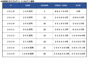 ブログを立ち上げてからの年ごとの投資額の推移を公開します。キャピタルゲインとインカムゲインの状況は以下の通りです。
